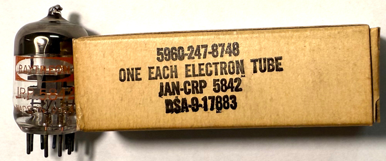 10 new old stock Raytheon JAN-CRP 5842 high-mu triode vacuum tubes in original box. Equivalent to 417A. Tested on Hickok AN/USM-118B tube tester.